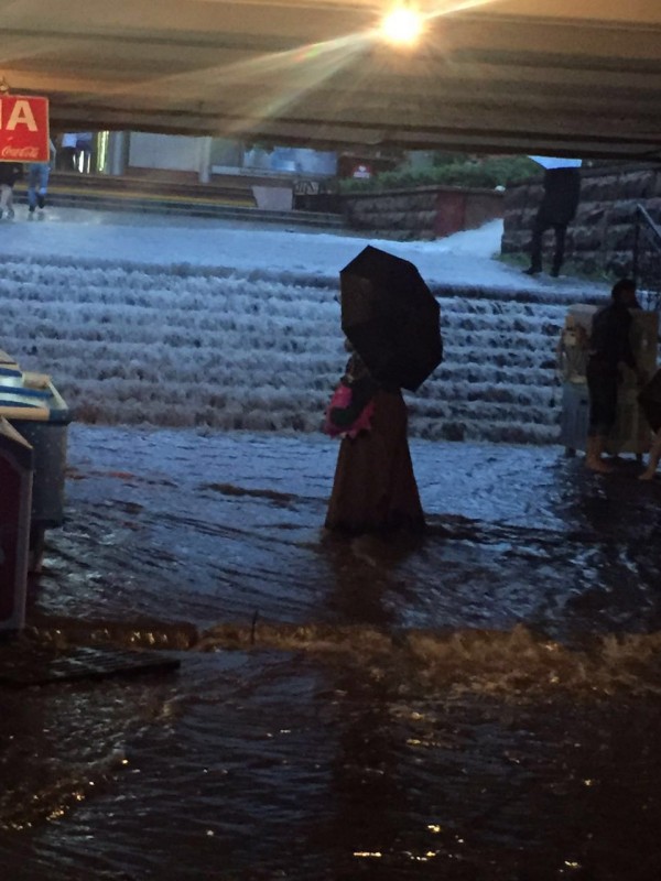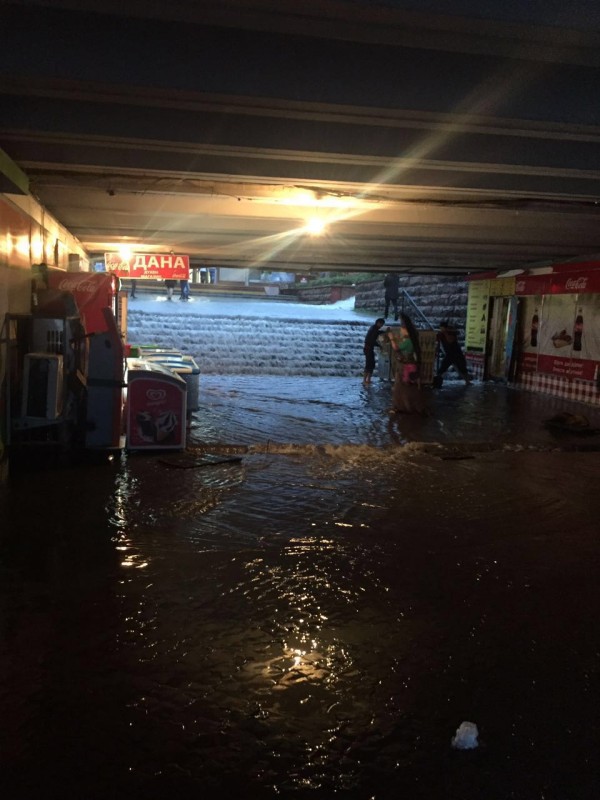 Подземный переход на пересечении улиц Жибек Жолы - Фурманова полностью затоплен водой. Пешеходы едва передвигаются сквозь потоки воды.