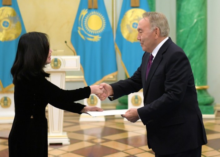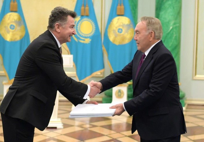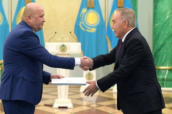 "Для меня большая честь сегодня вручить вашему превосходительству верительные грамоты", - сказал он на казахском языке.