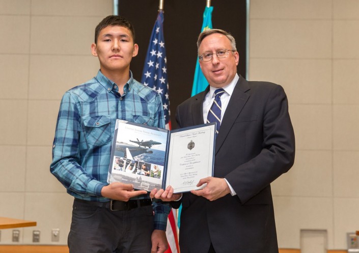 Посол США в Казахстане Джордж Крол вручил памятную монету и сертификат казахстанцу Алмасу Байшану, поступившему в американскую военную академию, передает корреспондент Tengrinews.kz со ссылкой на официальную страницу посольства в социальной сети Facebook.