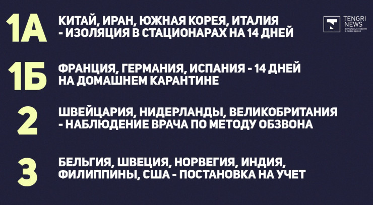Официальный представитель Министерства здравоохранения Диас Ахметшарип объяснил, что те, кто прибыл в течение последних двух недель из стран категории 1А - Китай, Иран, Южная Корея и Италия, подлежат изоляции в стационарах на 14 дней.