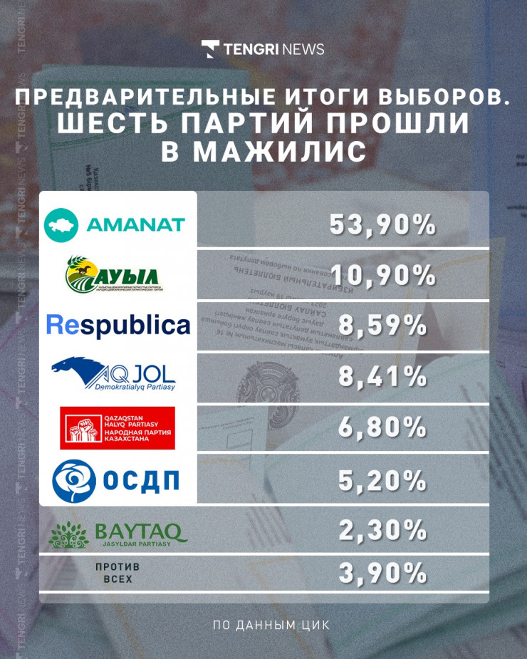 - Партия Amanat - 3 431 510 голосов или 53,90 процента;