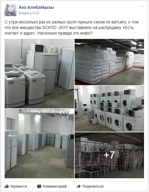 Отметим, в социальных сетях, в частности в группе Астана - Что? Где? Когда?, пользователи писали о получаемых сообщениях о распродаже имущества EXPO-2017.