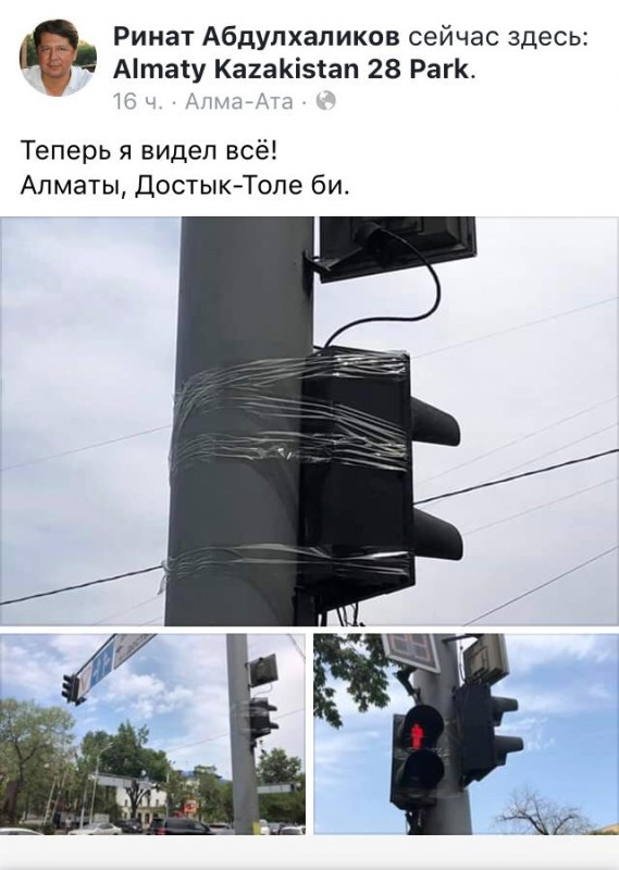 Житель Алматы Ринат Абдулхаликов опубликовал на своей странице в Facebook фотографии приклеенного скотчем светофора в центре города, передает корреспондент Tengrinews.kz.