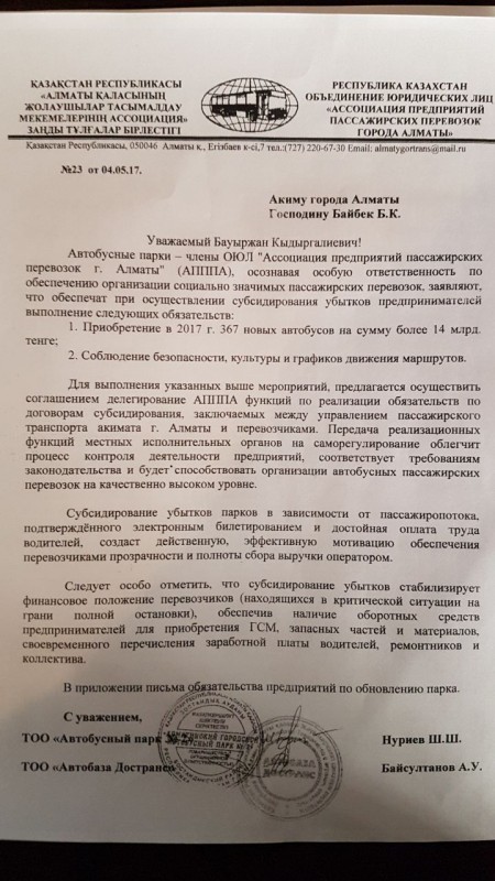 Перевозчики возмутились, что акимат заявил об отсутствии гарантий по улучшению работы. Предприниматели отмечают, что пункты о покупках автобусов, качественном сервисе, соблюдении графика движения указаны в типовом договоре, который они подписывают при получении на обслуживание маршрута. Но несмотря на это, они свои новые предложения по улучшению ситуации с общественным транспортом уже отправляли письмом акиму Алматы Бауыржану Байбеку.
