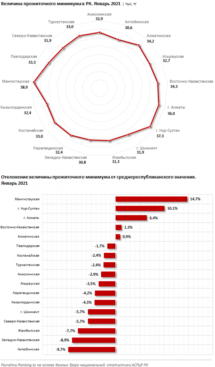 В региональном разрезе наибольшая величина прожиточного минимума традиционно приходится на Мангистаускую область: 38,9 тысячи тенге. Это на 14,7 процента больше среднереспубликанского уровня.