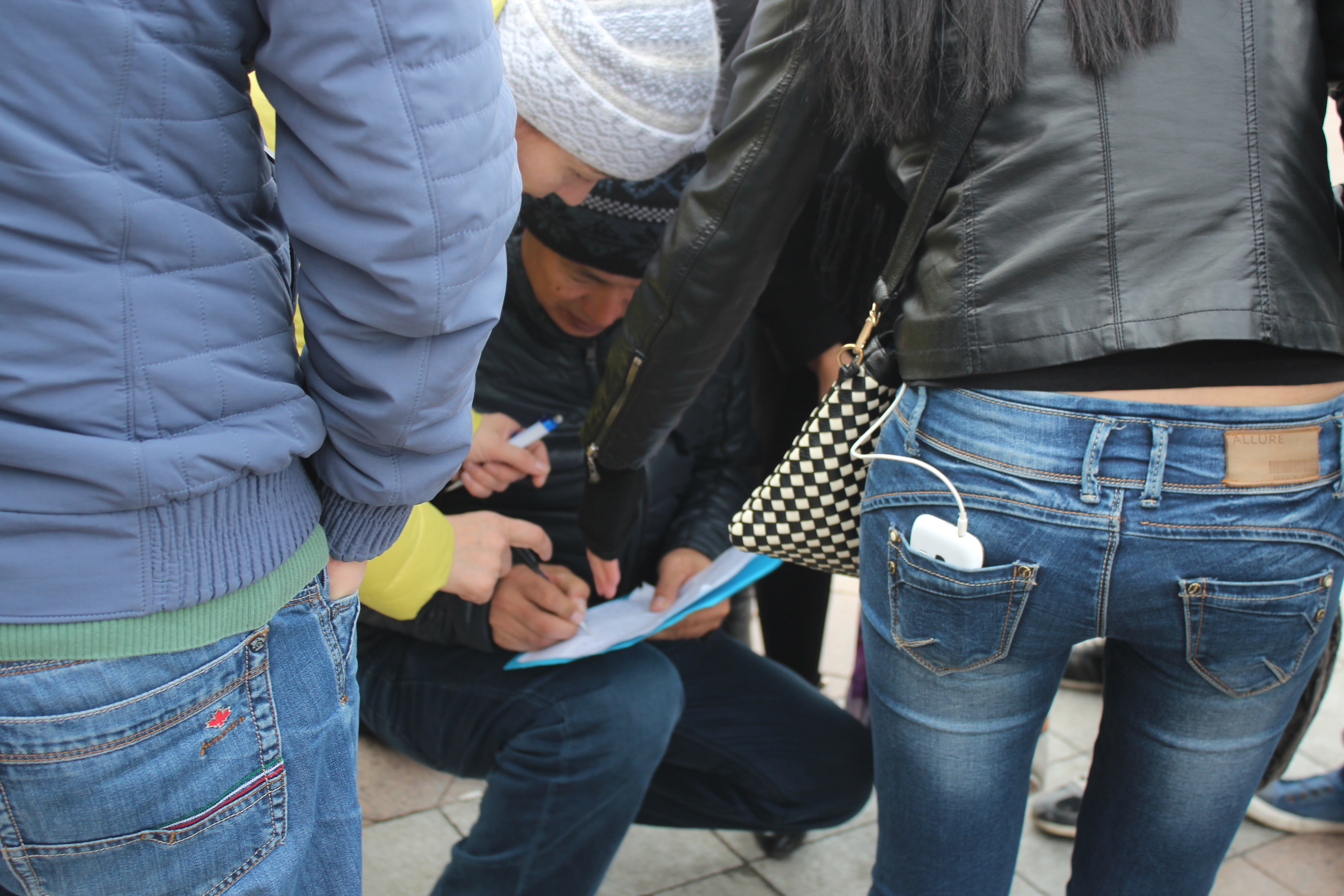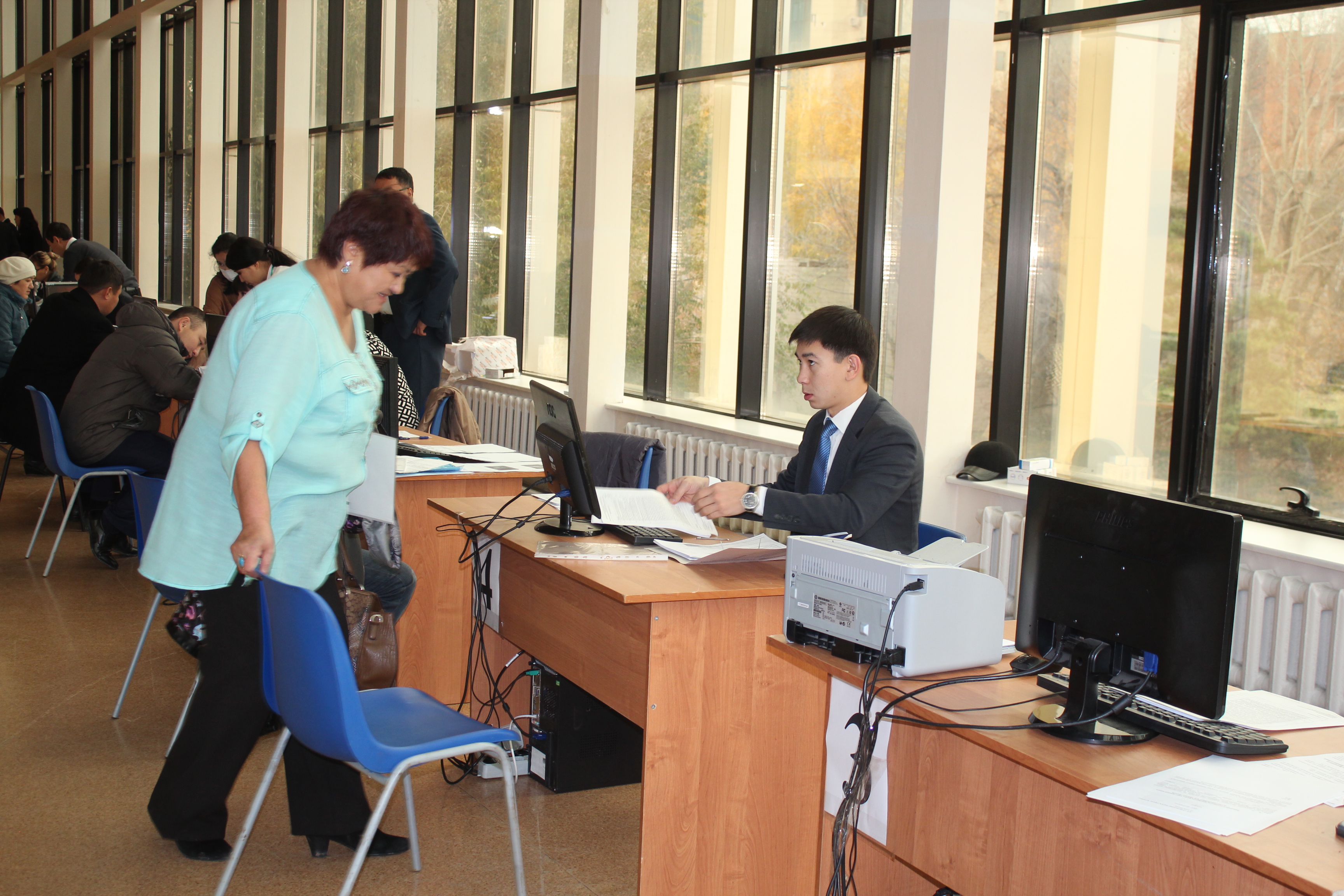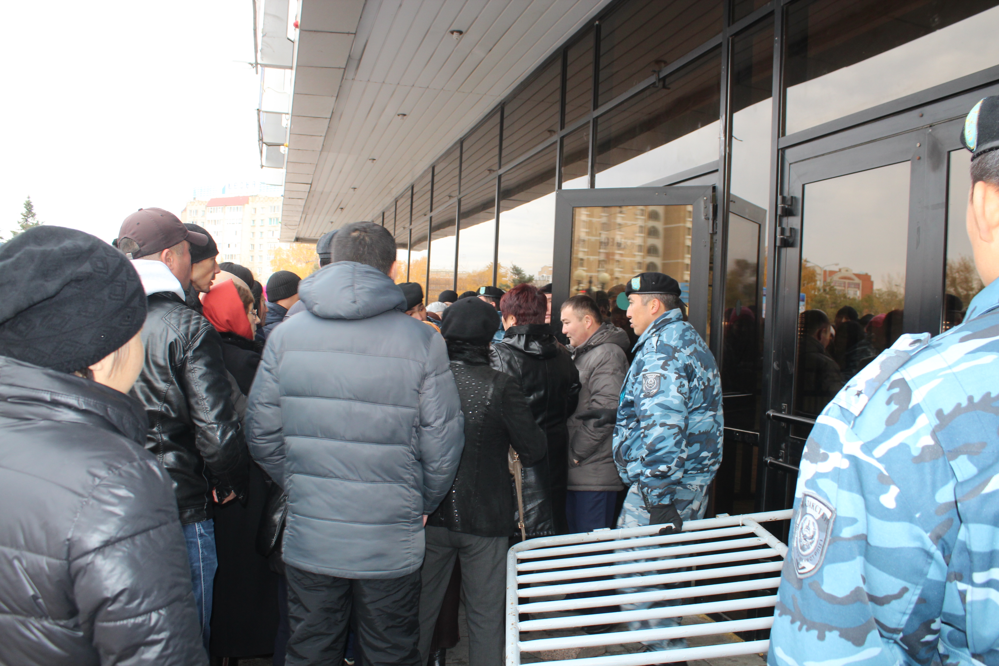 По уже сложившейся традиции таких мероприятий граждане начали составлять списки очередников. Какое-то время очередь формировалась на улице, но потом сотрудниками акимата было принято решение впустить всех в здание.