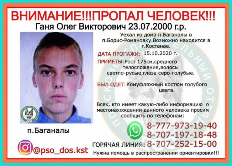 "Разыскивается Ганя Олег Викторович, родился 23 июля 2000 года. Пропал 15 октября, уехал из дома, из села Баганалы в село имени Павлова. Возможно, находится в Костанае", – уточняется в ориентировке, размещенной волонтерами в социальных сетях.
