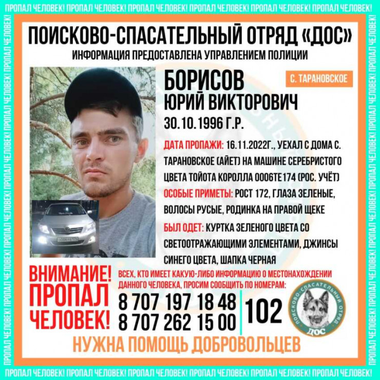 Борисов Юрий Викторович 16 ноября уехал из дома в селе Тарановское (Айет) на автомобиле Toyota Corolla серебристого цвета.