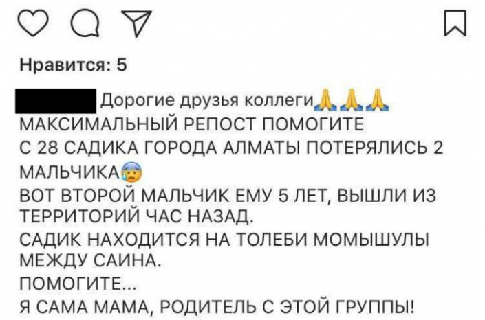 В рассылке сообщалось, что дети вышли за территорию детского сада, находящегося в районе улиц Толе би и Момышулы.