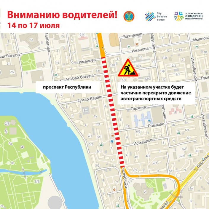 "С 14 по 17 июля текущего года начнется ремонт автомобильных дорог по проспекту Республики на участке от улицы Иманова до транспортной развязки в районе микрорайона "Самал". В связи с чем на указанном участке будет частично перекрыто движение автотранспортных средств", - говорится в сообщении.