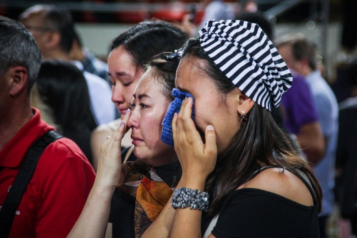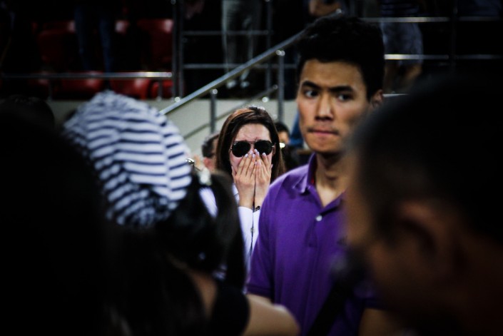 Люди в зале и на улице начинают аплодировать. Аплодируют сильно и долго. Люди, которые так и не смогли зайти внутрь, кладут цветы прямо на асфальт.