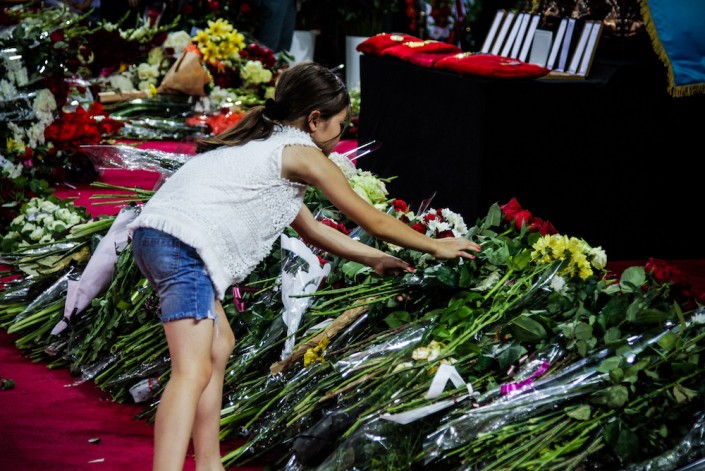 У гроба открытыми, сияя белым атласом, стоят коробки с многочисленными медалями Дениса Тена. Люди кладут цветы на пол, ставят венки за постаментом и довольно быстро проходят дальше - возможности подойти ближе нет.