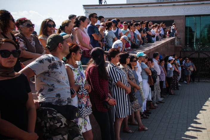 Около 10.00 открывают двери. На улице уже около 30 градусов. Медики на носилках уносят тех, кто упал в обморок от теплового удара. Очередь во Дворец спорта начинается от Центрального стадиона. Волонтеры делят желающих попасть внутрь на два потока. Внутрь пускают небольшими партиями. В соцсетях пишут, что некоторые за 2 часа так и не смогли пройти во дворец. Они повезли цветы к месту убийства Дениса на Курмангазы - Байсеитовой.
