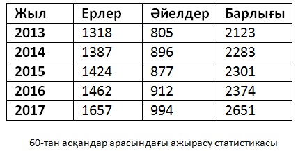Толығырақ тоқталсақ, 2013-2017 жылдар аралығына жүргізілген зерттеуде жыл сайын ажырасу жағдайларының көбейіп келе жатқаны анықталған. Мәселен, 2013 жылы алпысты алқымдаған 2123 қария мұндай қадамға барса, 2014 жылы 2283, 2015 жылы 2301, 2016 жылы 2374, 2017 жылы 2651-і өмірлік серігімен қош айтысқан.