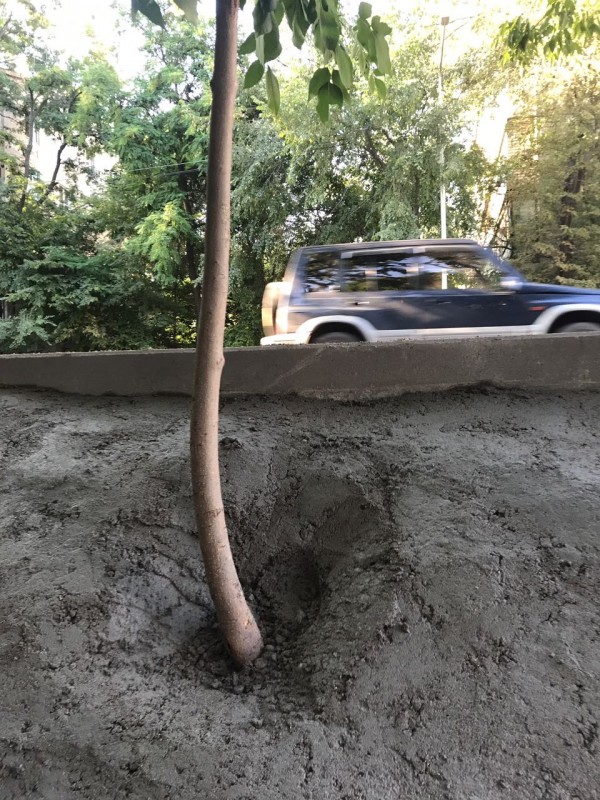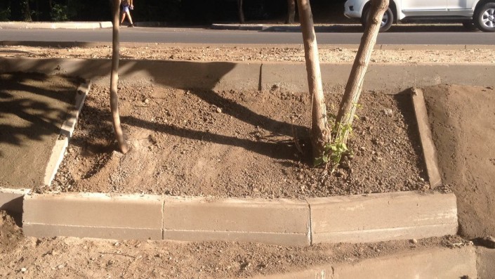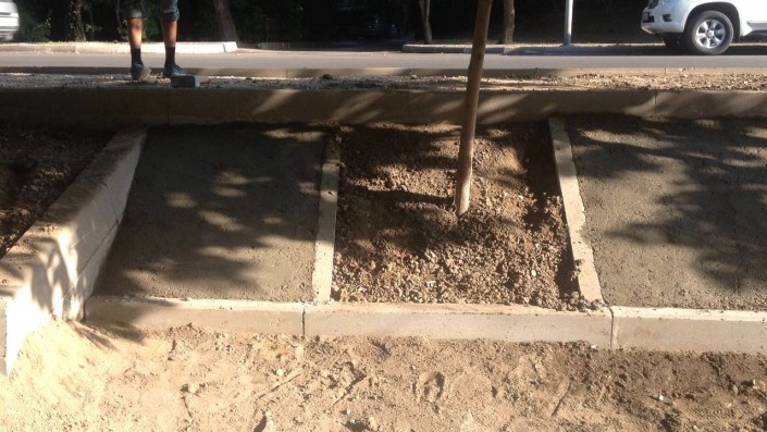 В Алматы рабочие забетонировали молодые деревья, сообщает корреспондент Tengrinews.kz.