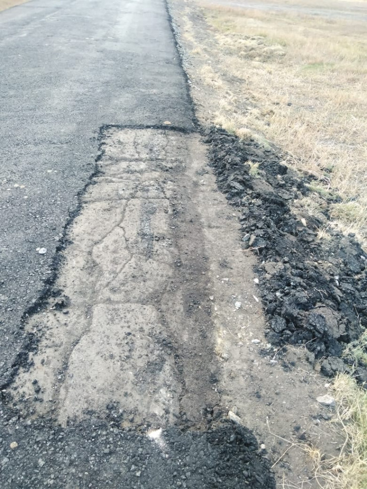 "Для качественного ремонта нам не хватило щебня, битума. Были и другие рабочие моменты. В некоторых местах под асфальтом виден песок, это объясняется тем, что ширина дороги 5 метров, но у нас большая часть полотна идет шире, и в этих местах мы, грубо говоря, чуть-чуть залезли на песок. Нам сделали замечание, мы все устраним", - заявил представитель субподрядной фирмы Ваге Агабекян.