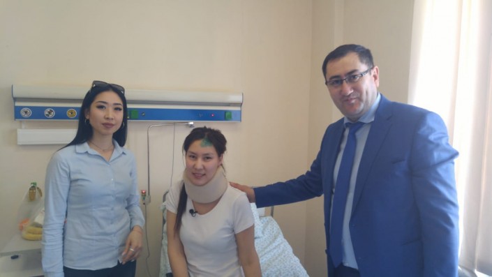 На фото - пострадавшая фельдшер Камар Сатбаганбетова (в центре). Слева от нее фельдшер Арайлым Канафина, буквально на ее глазах произошло массовое ДТП. Справа главный врач городской станции скорой медицинской помощи Тимур Муратов.