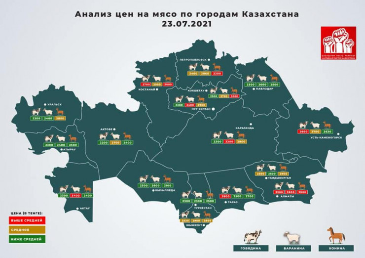 Представители партии опубликовали карту с ценами на мясо в разных городах Казахстана.