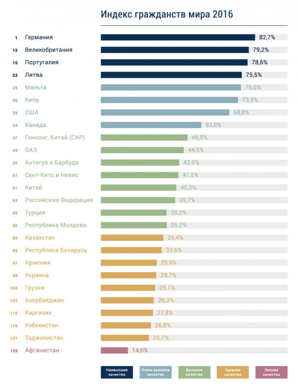 Первое место в рейтинге заняла Германия. Второе место разделили Дания и Франция. Кроме того, в пятерку лидеров вошли Исландия, Швеция и Норвегия. Самыми непривлекательными странами для получения гражданства оказались Центральноафриканская Республика и Афганистан.