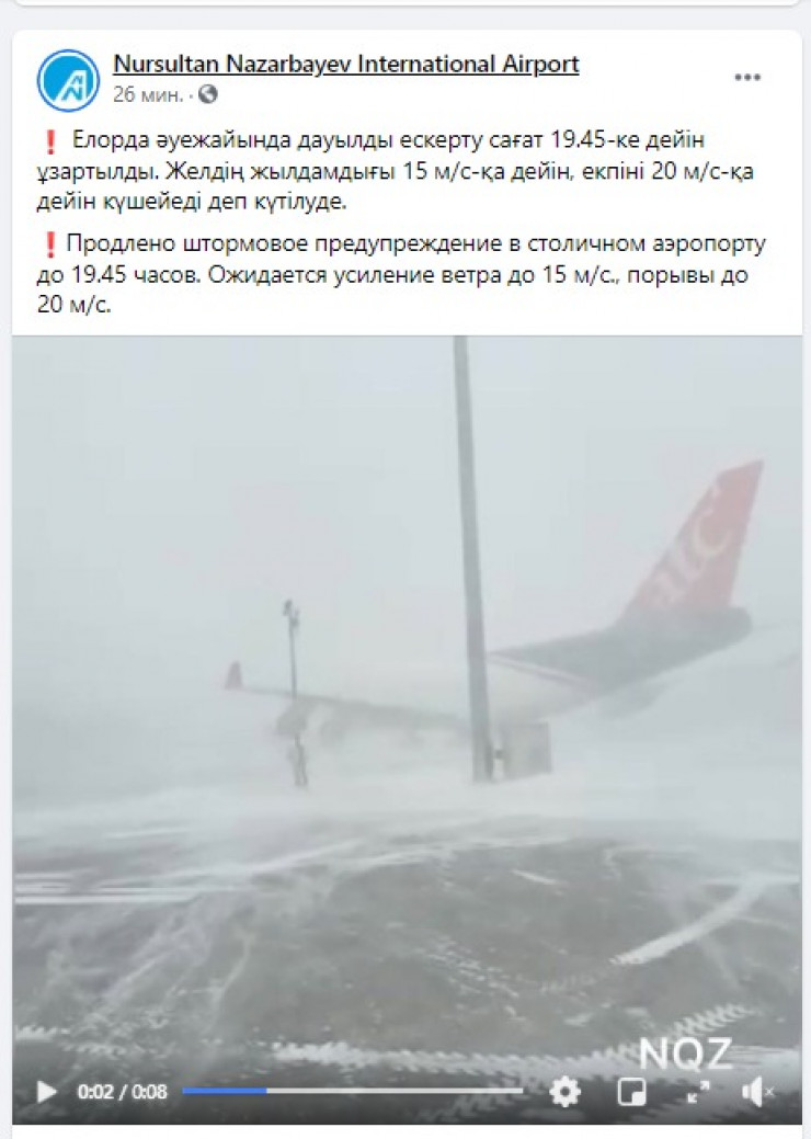 По данным воздушной гавани, штормовое предупреждение продлено в аэропорту Нур-Султана до 19.45.