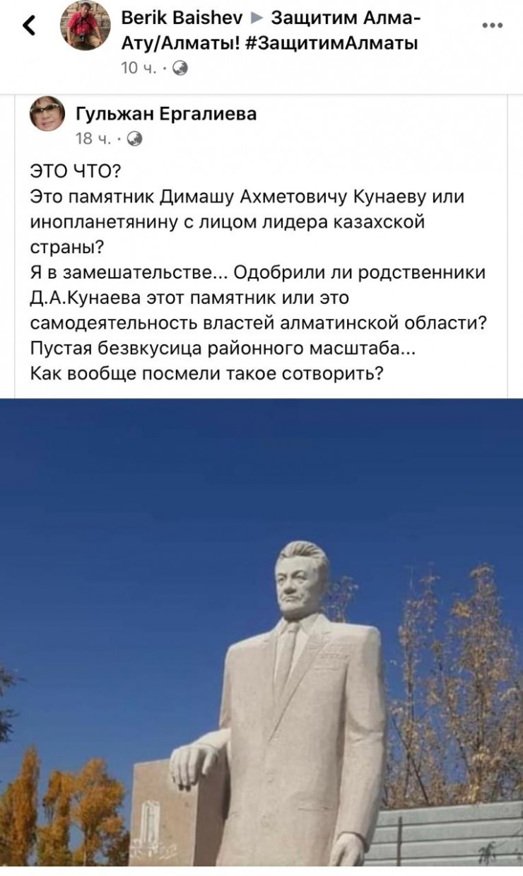 "Открытие памятника Кунаеву - дело хорошее. Но вопрос, какой памятник! Пропорции тела, которые подобрал скульптор к памятнику, не узнали даже его родные племянницы. Тело в сравнении с головой слишком растянутое, и руки очень большие. И показан он каким-то худощавым, с уродливо большими плечами. Он был высоким, но не таким, как в скульптуре", - написал Базарбек.