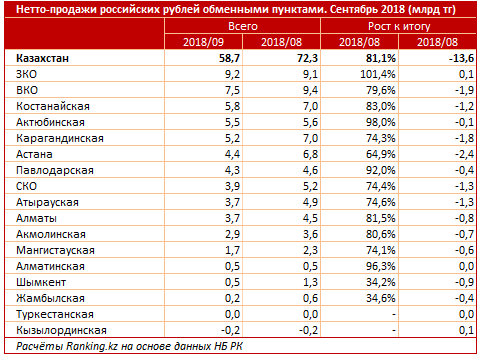 Среди регионов РК в сентябре отрицательные объeмы нетто-продаж российских рублей были зафиксированы только в двух областях - Кызылординской и Туркестанской. Казахстанцы там сдали в обменники больше рублей, чем выкупили.