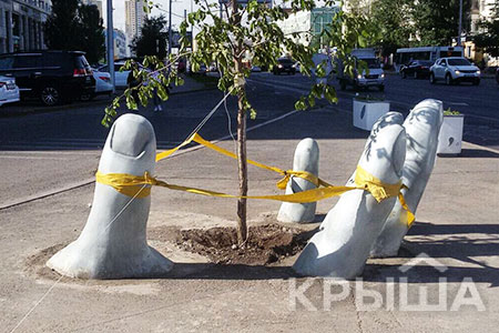 Скульптура изображает пальцы, между которыми расположено живое дерево, при этом пальцы гигантской руки обтянуты яркой сигнальной лентой.