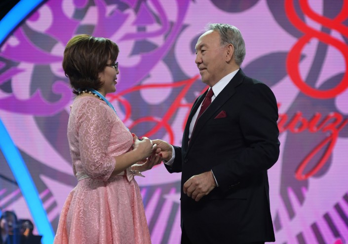 После поздравительной речи Президент вручил многодетным матерям нагрудные знаки "Алтын алқа" и "Күміс алқа". Жительница Южно-Казахстанской области Айгуль Тузельбаева была удостоена золотой подвески, а жительница Астаны Раушан Аяганова - серебряной.