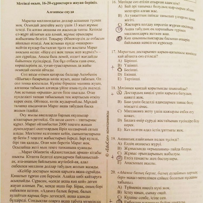 Между тем в Национальном центре тестирования сообщили, что данный опросник является материалом частного учебного центра. "Частные центры часто разрабатывают свои вопросы. Этот опросник является их разработкой. Это их текст и их вопросы. Данная часть тестируемого материала взята из нового формата ЕНТ. А именно направление "читательская грамотность", которая заменяет на ЕНТ казахский язык и литературу. И "читательская грамотность" - один из главных предметов на ЕНТ. На самом ЕНТ этого текста и вопроса не будет, так как это разработка частной компании", - отметила руководитель отдела информации и аналитики Асель Шарбекова.
