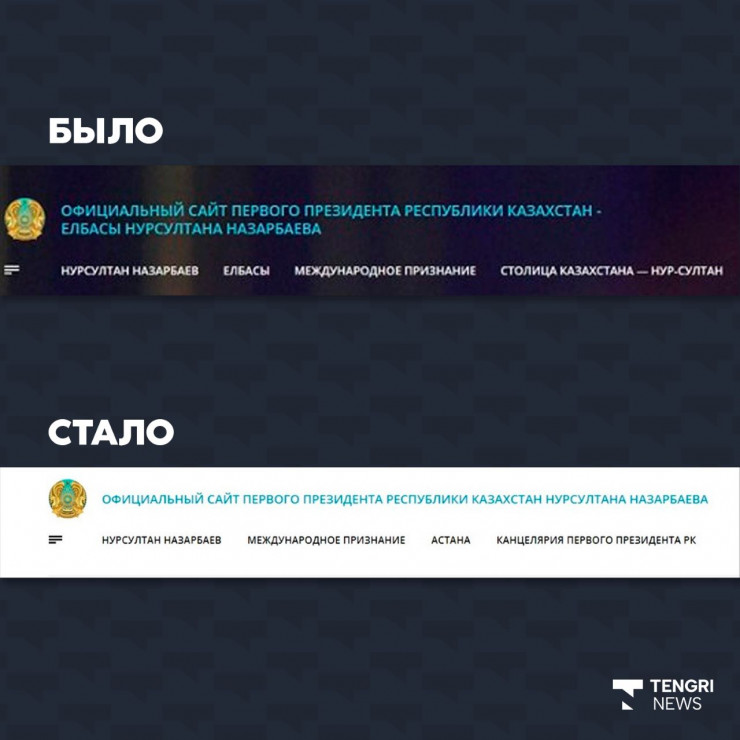 Изменилась и шапка сайта. Если раньше там было написано "Официальный сайт Первого Президента Республики Казахстан - Елбасы Нурсултана Назарбаева", то теперь в названии убрали слово "Елбасы".