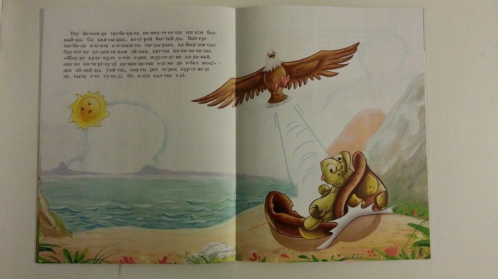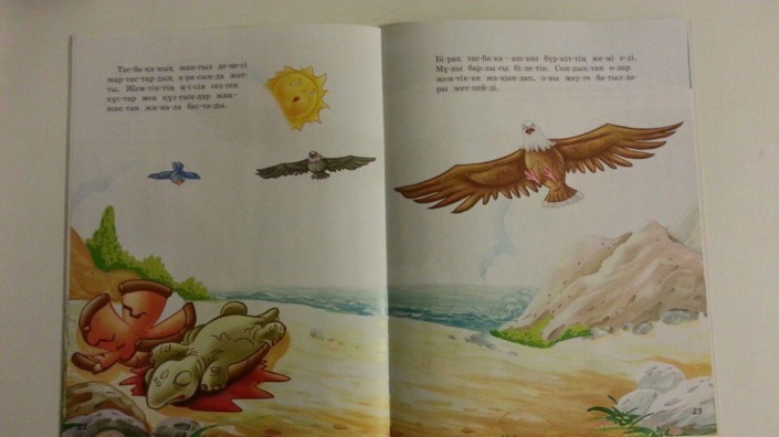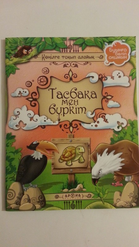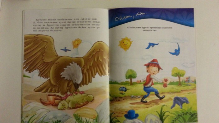 Речь идет о казахскоязычной книге под названием "Тасбақа мен буркiт". На одной из ее страниц изображен беркут, схвативший когтями черепаху, и сбросивший ее с высоты. В последующих рисунках показано, как от удара у черепахи раскалывается панцирь и вытекает кровь, а птица подлетает и начинает клевать мертвое животное.
