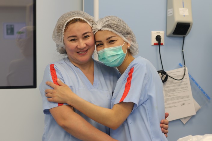 "У нас существует стереотип, что это женская работа, - говорит медсестра Рза Нурпеисова, или, как принято обращаться в медицинской практике, Рза Аманжоловна. Так же, но с большим трепетом в голосе ее называет Сарвиназ: Рза Аманжоловна – ее ментор. Она обучала, советовала, присутствовала на операциях, когда нужна была помощь, так многие девочки из медколледжа трансформируются в опытных медсестер, и все же".