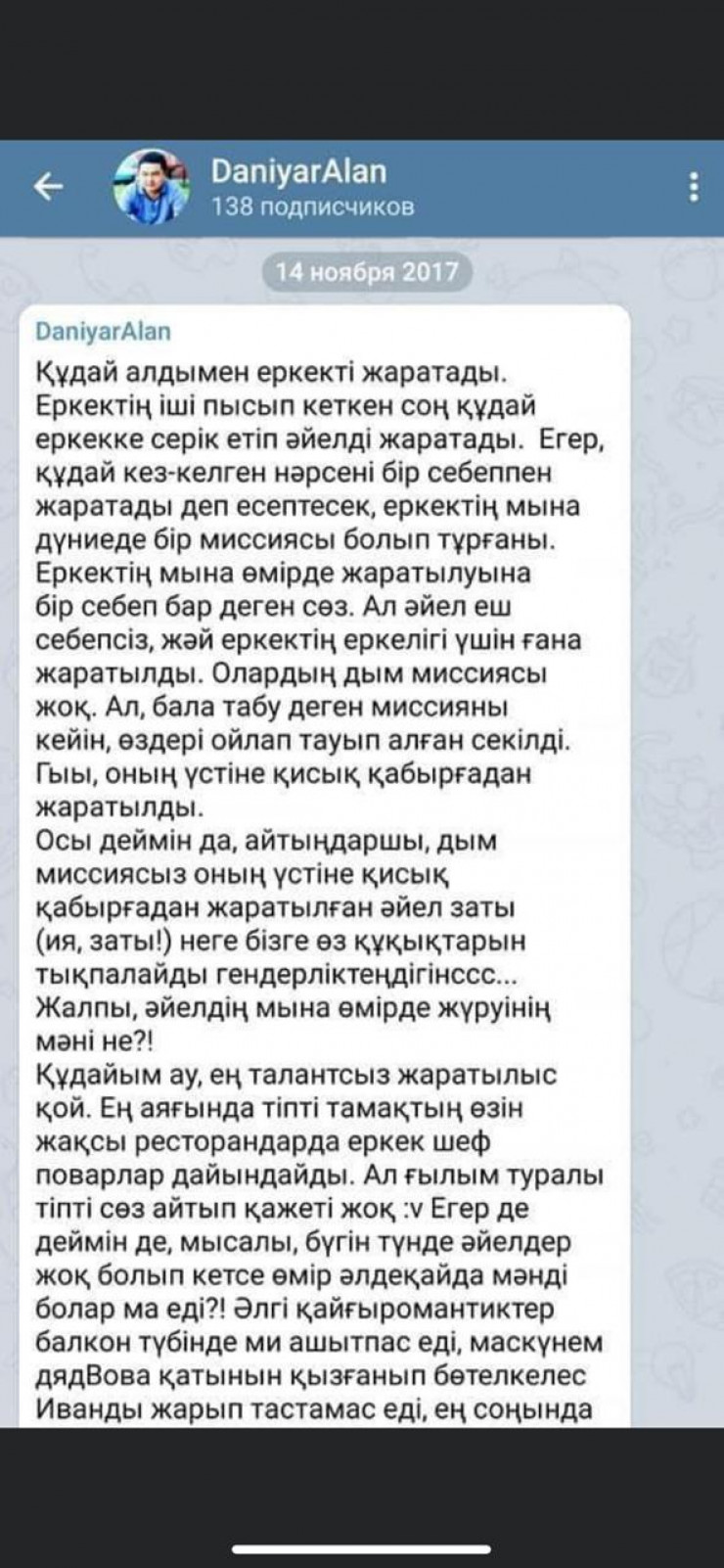 "Бог создал мужчину первым. Когда мужчина заскучал, Бог создает ему в спутники женщину. Если мы верим, что Бог любую вещь создал с какой-то целью, то у мужчины есть одна миссия в этом мире. Есть причина, из-за которой мужчина был создан в этом мире. А женщина была создана без причины, лишь для каприза мужчины. У них никакой миссии нет. А миссия рожать ребенка, кажется, была позже выдумана ими самими. Ко всему прочему, (они) созданы из кривого ребра. И вот говорю же, скажите мне, почему женщина (да, вещь!), созданная из кривого ребра, без никакой миссии, пихает нам свои права гендерного равенства", - написал Данияр Алан.