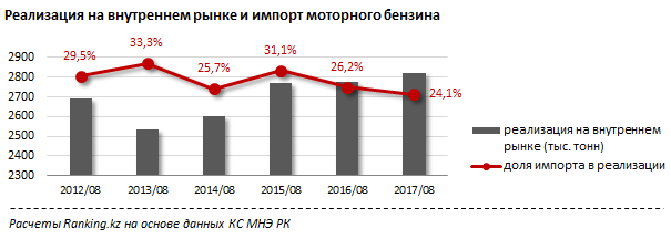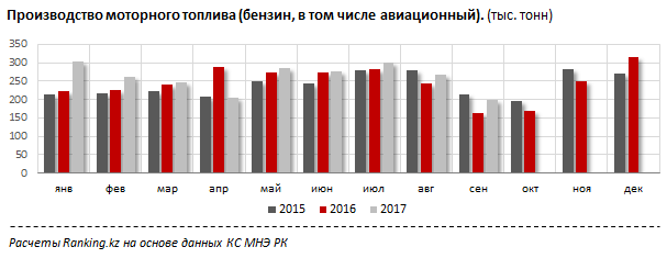 Однако текущего ускорения производства недостаточно, чтобы удовлетворить спрос на топливо со стороны казахстанских автолюбителей в полной мере. За январь-август 2017 года на внутреннем рынке было реализовано 2,8 миллиона тонн моторного бензина, или на 47,5 тысячи тонн больше, чем за аналогичный период 2016 года. В прошлом году (январь-август) годовой прирост потребления бензина составил всего 3,1 тысячи тонн.
