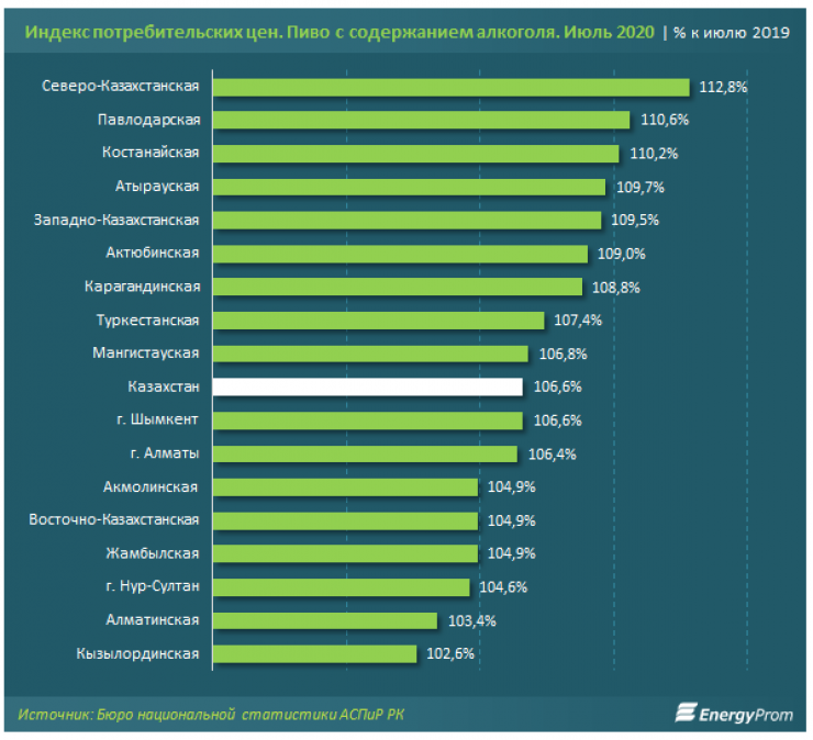 В Казахстане показатели значительно ниже: 29,3 литра пива на человека, при средних затратах в 305,23 доллара в год. В России показатели серьезно опережают Казахстан: 87,4 литра на человека, при средних затратах сразу в 1345,8 доллара в год.