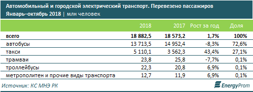 Основная доля автомобильного и городского электрического транспорта пришлась на автобусы: 72,6 процента. При этом автобусные перевозки сократились сразу на 8,3 процента за год. А вот услугами такси воспользовались на 43 процента пассажиров больше, чем годом ранее. Всего за 10 месяцев 2018 года на автомобильном и городском электрическом транспорте перевезли 18,9 миллиарда пассажиров.