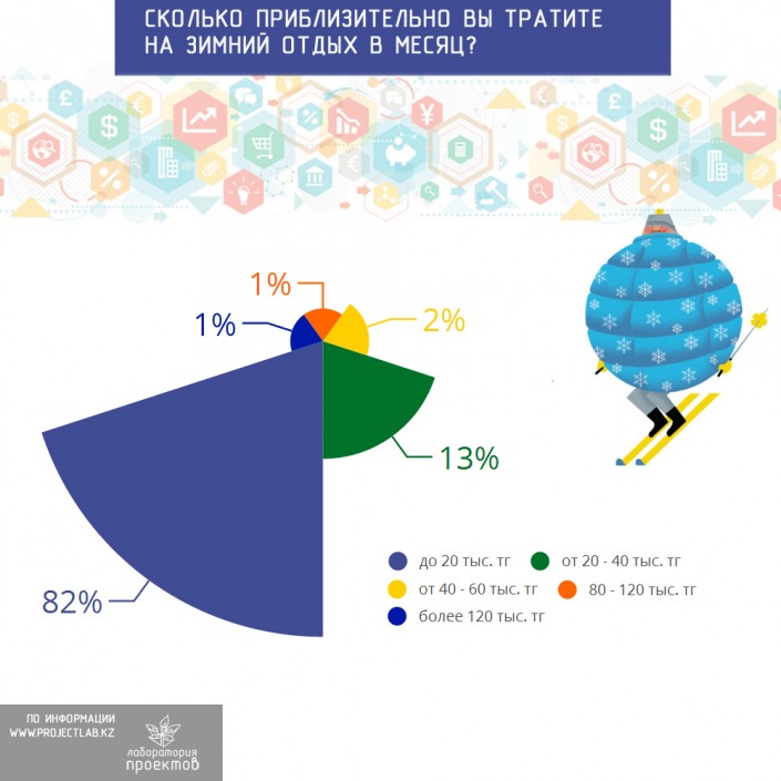 Агентство также выяснило, что для 82 процентов участников исследования зимний отдых обходится в среднем до 20 тысяч тенге, 13 процентов опрошенных тратят от 20 до 40 тысяч тенге, и только 1 процент может потратить более 120 тысяч тенге.