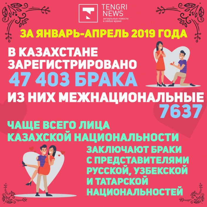 Сообщается, что за январь-апрель 2019 года в стране зарегистрировано 47 403 брака, из них 7 637 браков, или 16,1 процента, заключены между представителями разных национальностей.