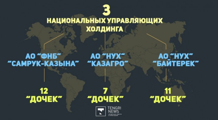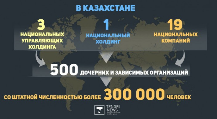 По данным Министерства национальной экономики, в Казахстане три национальных управляющих холдинга, один национальный холдинг и 19 нацкомпаний.