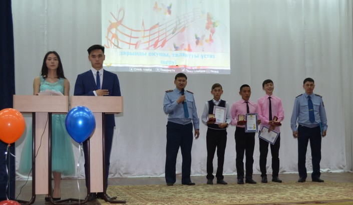 Благодарственные письма и наручные часы ученикам 9 класса средней школы № 2 села Караоткель Целиноградского района Жансерику Бакытжан, Аяну и Темирлану Пышинским полицейские вручили на торжественной линейке в присутствии педагогов и других учеников школы.