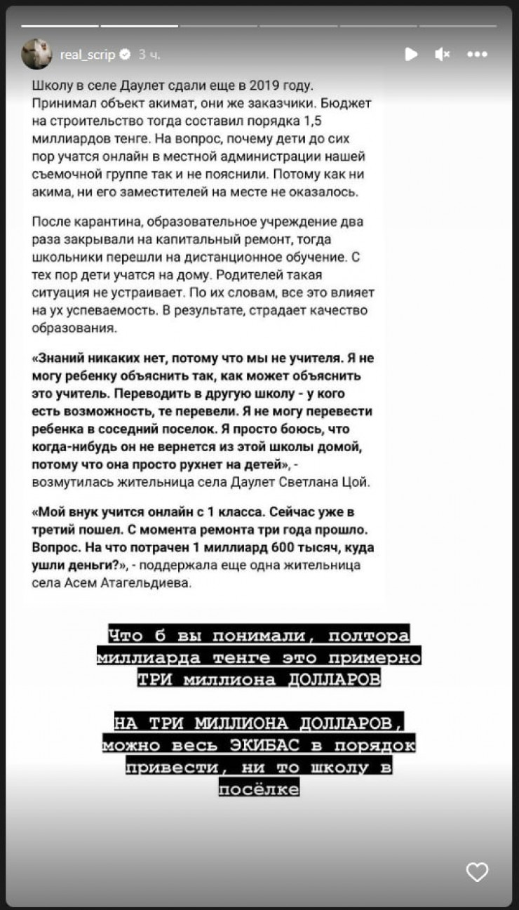 На эту публикацию Скриптонит эмоционально отреагировал в своем Instagram. Он отметил, что полтора миллиарда тенге хватило бы не на одну школу, а информацию, что строителям не выплачивают зарплату и акимат в курсе ситуации, он назвал "смешной".