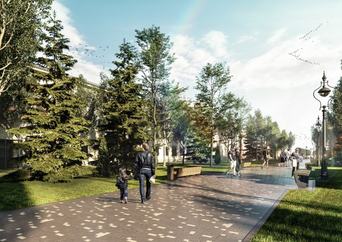 Рядом со зданиями появятся палисадники, сезонные кафе. С каждой стороны проезжей части улицы Толе би посадят деревья и другие зеленые насаждения. Планируется установить уличные скамьи, урны, вазоны. При этом фонтаны не предусмотрены.