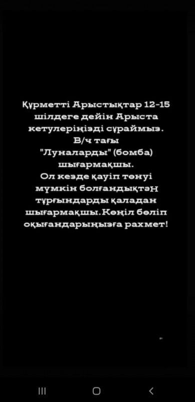 "Я, житель Арыси Жаксылыкова Роза Оспанхановна, с 12 по 15 июля в WhatsApp распускала слухи о том, что из города вывозят бомбу "Луна". Я это сообщение отправила картинкой в группу "Арыс қаласы". Я прошу прощения за недостоверную информацию", - сказала она.