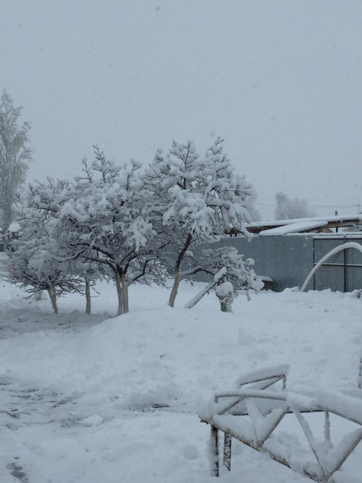 9 апреля южные города Казахстана и соседних центральноазиатских республик, в которых температура воздуха уже поднималась до плюс 25, завалило снегом. Пользователи социальных сетей делятся видео и фотографиями зеленых растений, покрытых белом полотном, передает корреспондент Tengrinews.kz.
