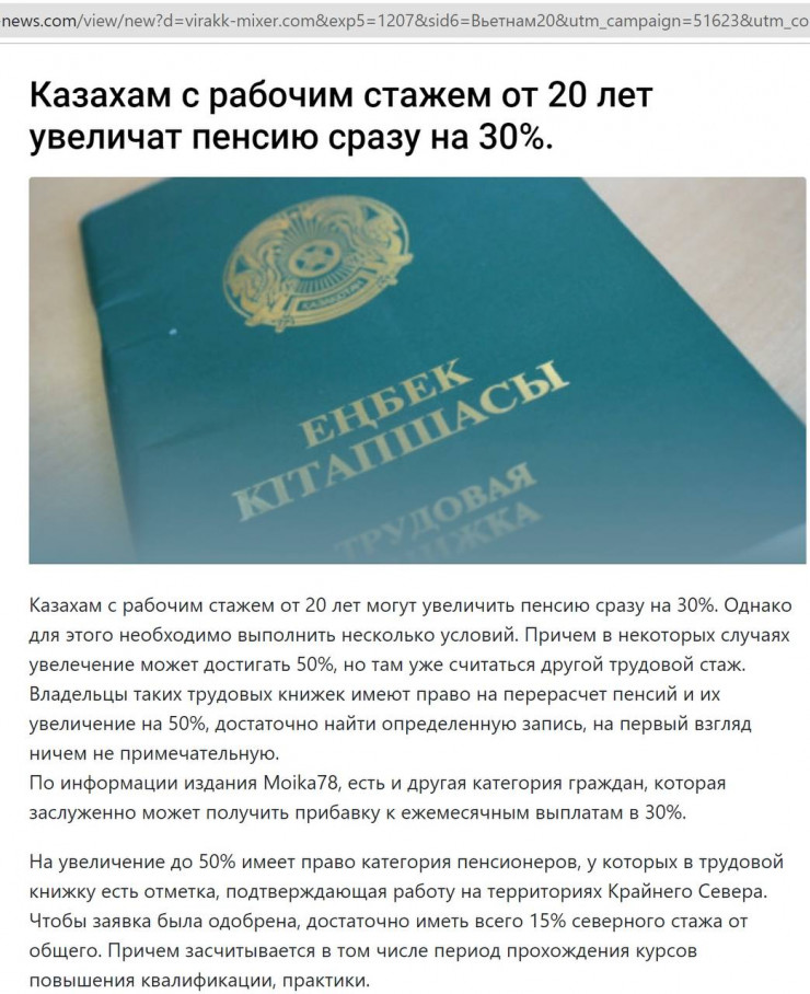 Казахстанцы начали получать информацию о том, что гражданам, имеющим рабочий стаж более 20 лет, увеличат пенсию сразу на 30 процентов. Фейковую информацию о повышении пенсии для казахстанцев распространили на российских порталах, передает корреспондент Tengrinews.kz. В Министерстве труда и социальной защиты населения прокомментировали случай.