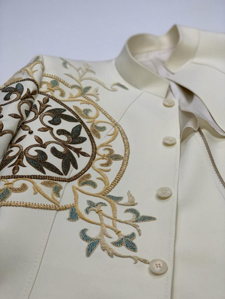 "Сначала идет подборка материалов, делаются многочисленные образцы. Даже во время пошива бывают моменты, когда все может поменяться на 180 градусов, и для этого нужно время. Для полного удовлетворения хотелось бы больше времени. Конечно, моя команда сработала на отлично. Были и бессонные ночи, так как орнаменты нужно было вышивать вручную, все должно было быть идеально", - отметила Виолетта.
