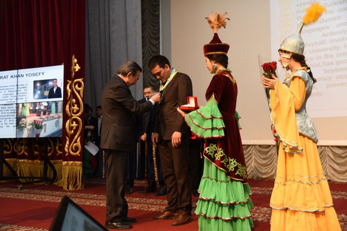 Афганскому студенту Башарату хан Юсофи, который остановил неуправляемый трамвай во время ДТП в Алматы 13 октября 2015 года, присвоили звание "Гордость университета", передает корреспондент Tengrinews.kz. Памятную медаль и диплом вручил ректор Казахского национального медицинского университета имени Асфендиярова Айкан Аканов в рамках церемонии, посвященной 85-летию ВУЗа. Хан Юсефи был награжден наряду с такими выпускниками вуза, как личный врач космонавта Айдына Аимбетова Сауле Туруспекова и вице-премьер министр Кыргызстана Дамира Ниязалиева. Их имена сейчас размещены на табличках на специальной аллее вуза, называющейся "Успех года".