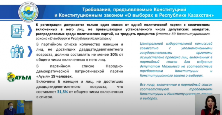 Председатель ЦИК Берик Имашев отметил, что все процедуры партией "Ауыл" соблюдены. Члены ЦИК единогласно проголосовали за регистрацию партийного списка на выборы в Мажилис. Берик Имашев поручил выдать партийцам удостоверения кандидатов в депутаты.