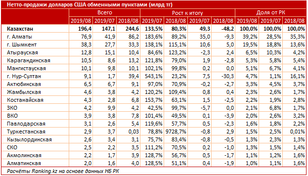 Объем чистых продаж обменными пунктами долларов за январь–август 2019 года составил 1,3 триллиона тенге - на 60,3 процента, или 482,6 миллиарда тенге, больше, чем за аналогичный период прошлого года.