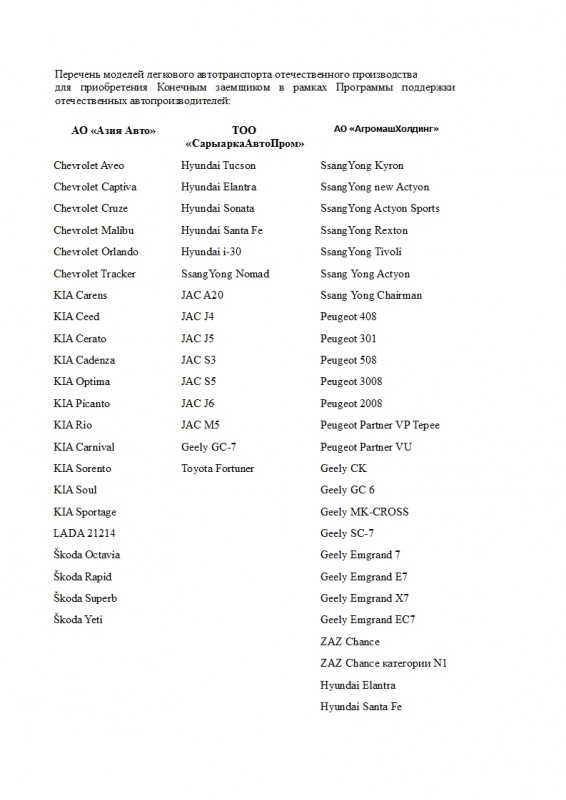 Весь список авто, которые можно приобрести по программе льготного автокредитования, выглядит так: